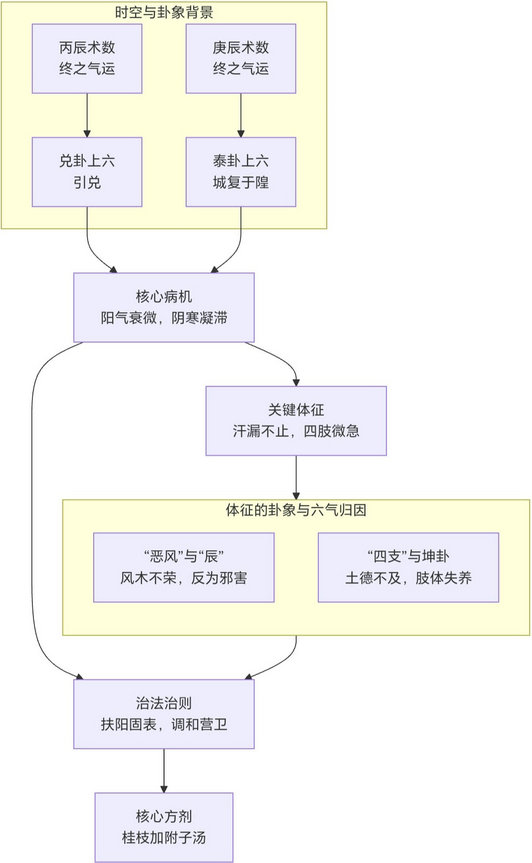 病机升华:桂枝加附子汤证,不仅是“表虚漏汗”,更是在特定时空气化下(丙辰/庚辰终之气),人体小宇宙的“泰”局崩塌、“兑”机受阻的体现。是阳气被郁、被引、最终濒临崩溃的动态过程。
